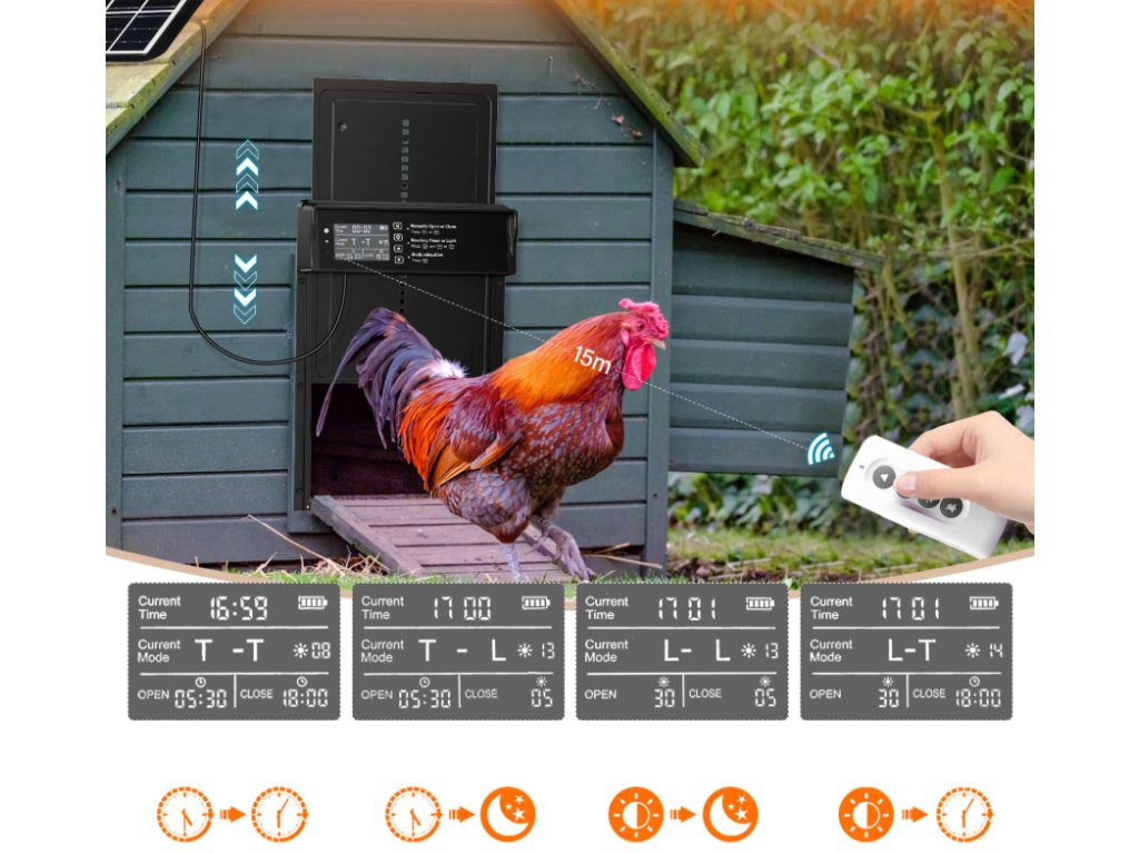 Az egyedülálló automata tyúkólajtó távirányítóval rendelkezik, amelynek hatótávolsága akár 40 méter , így az ajtót anélkül nyithatja vagy zárhatja, hogy oda kellene mennie az ólhoz. A távirányító intuitív és kényelmet biztosít a háziállatokkal végzett mindennapi munkában. Csak egy gombnyomás, és minden a helyén van.