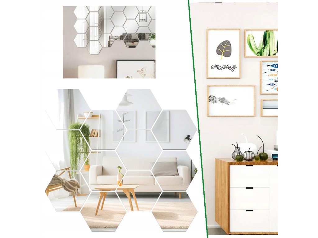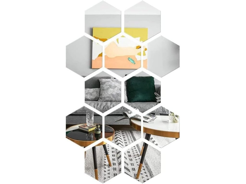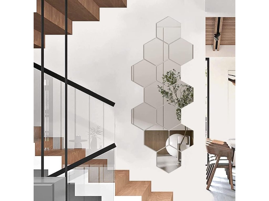A tizenkét hatszögből álló készlet végtelen elrendezési lehetőséget kínál. A precíz geometriai mintáktól az absztrakt mozaikokig. A tükörmatricákat elhelyezheti egyetlen falon domináns elemként, vagy eloszthatja őket a belső tér több pontján is finom design akcentusként.