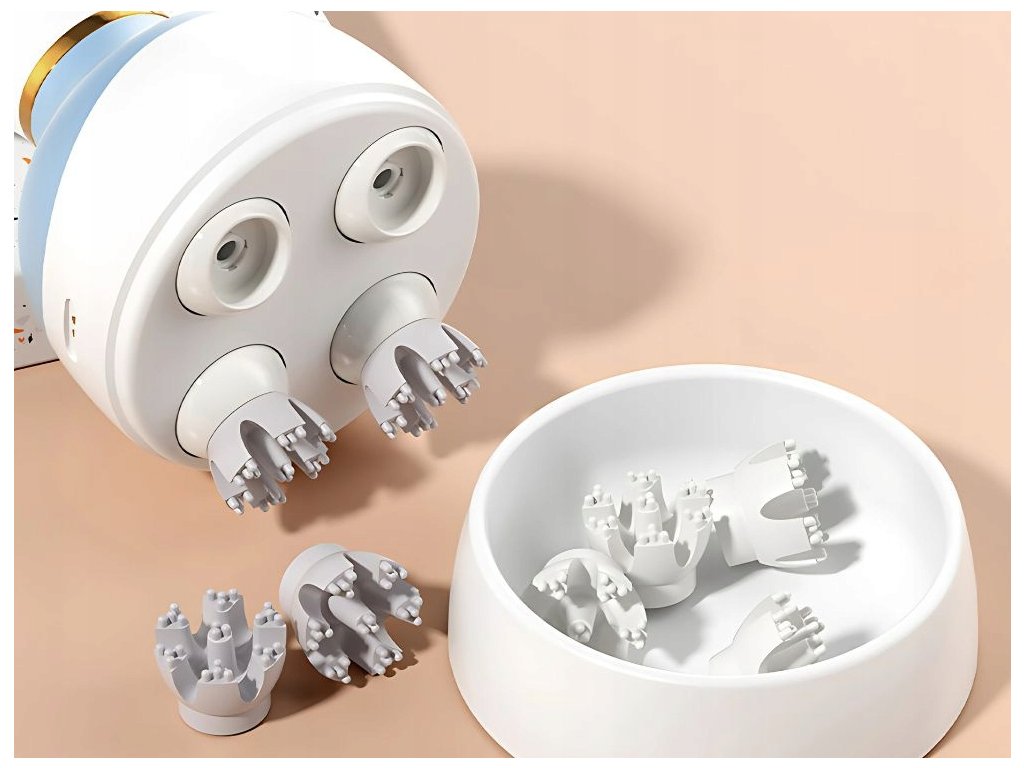 A kiváló minőségű elektromos fejmasszírozó akár négy rugalmas, masszázsfejjel ellátott fejjel rendelkezik, amelyek biztosítják a fej minden részének alapos és egyenletes masszírozását . A fejek könnyen levehetők és tisztíthatók , ami higiénikus használatot garantál. Ez a praktikus felszerelés meghosszabbítja az élettartamot és megőrzi a masszírozó hatékonyságát.