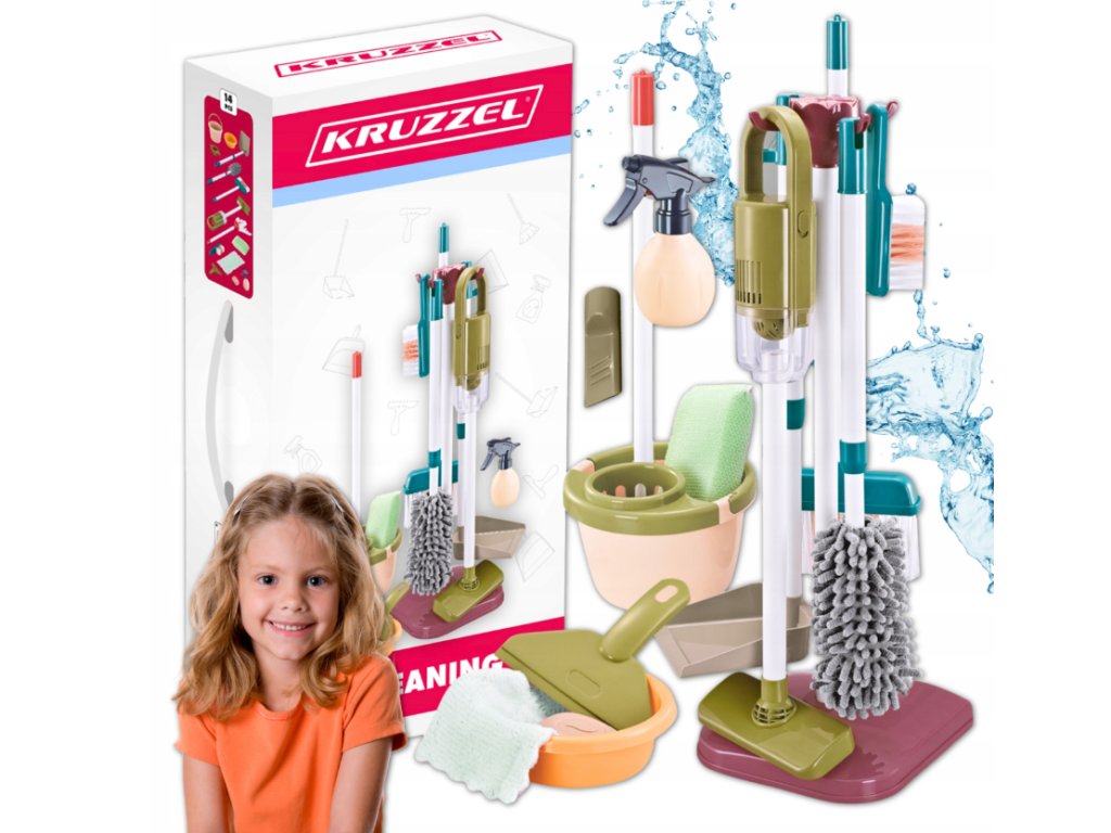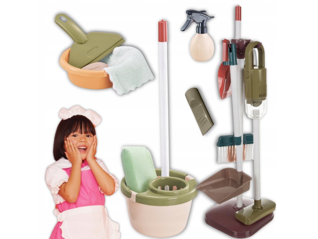 Ez a szokatlan takarítókészlet gyerekeknek számos kiegészítővel fogja meglepni. Ezek közé tartozik egy porszívó, felmosó, vödör, seprű és egyéb kiegészítők, amelyek nélkül egyetlen háztartási segítő sem boldogulhat.