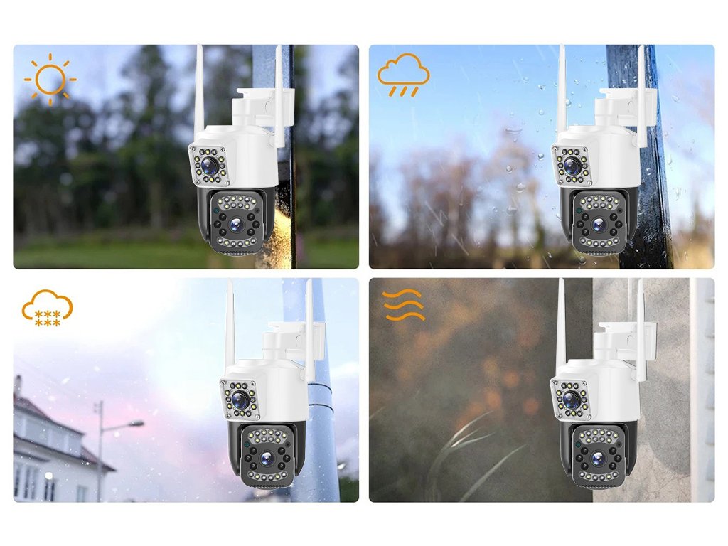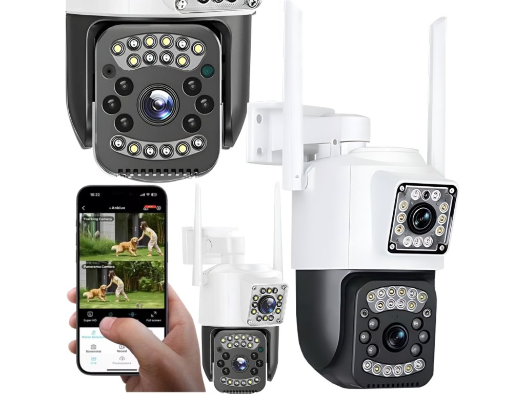 A dupla kültéri WiFi kamera két lencsével rendelkezik, az egyik statikus , a másik forgó . A statikus folyamatosan rögzíti a tér egy részét, míg a forgó akár 355°-os vízszintes és 90°-os függőleges tartományon belül képes követni a mozgást.