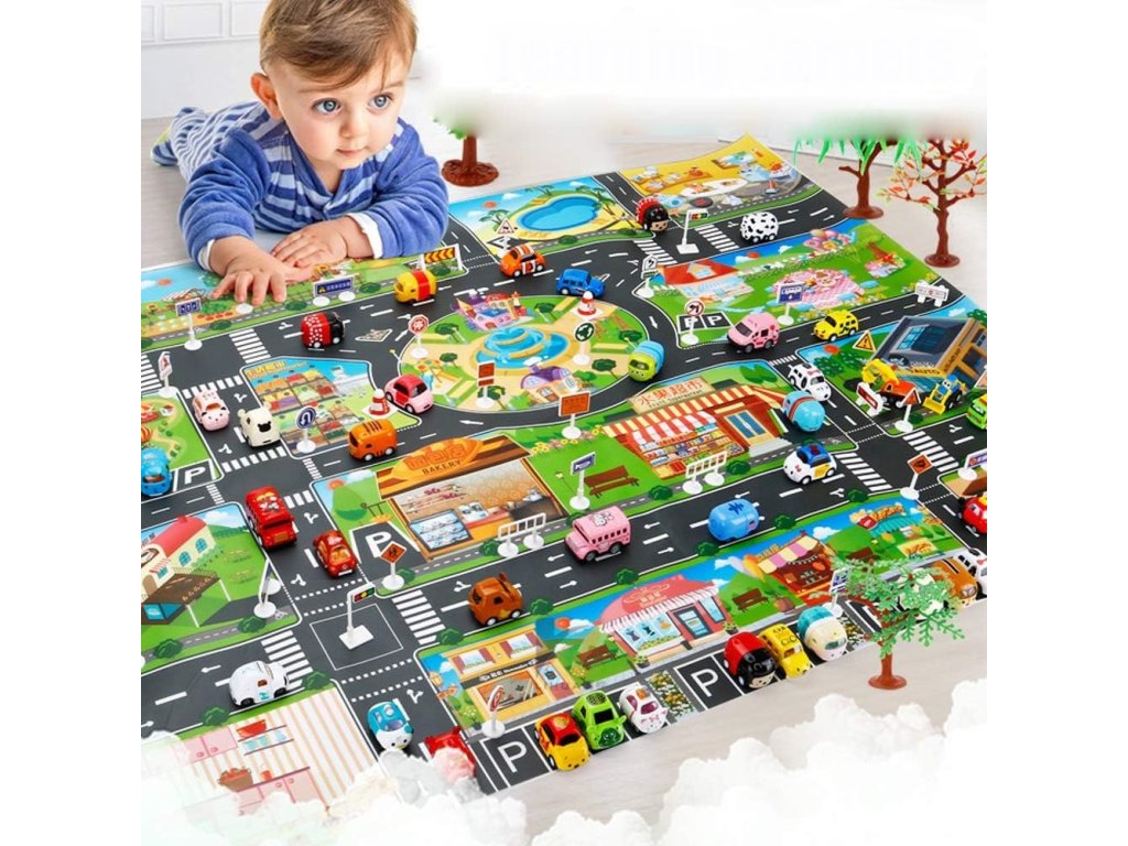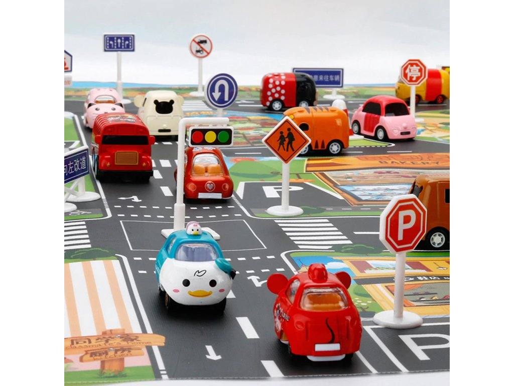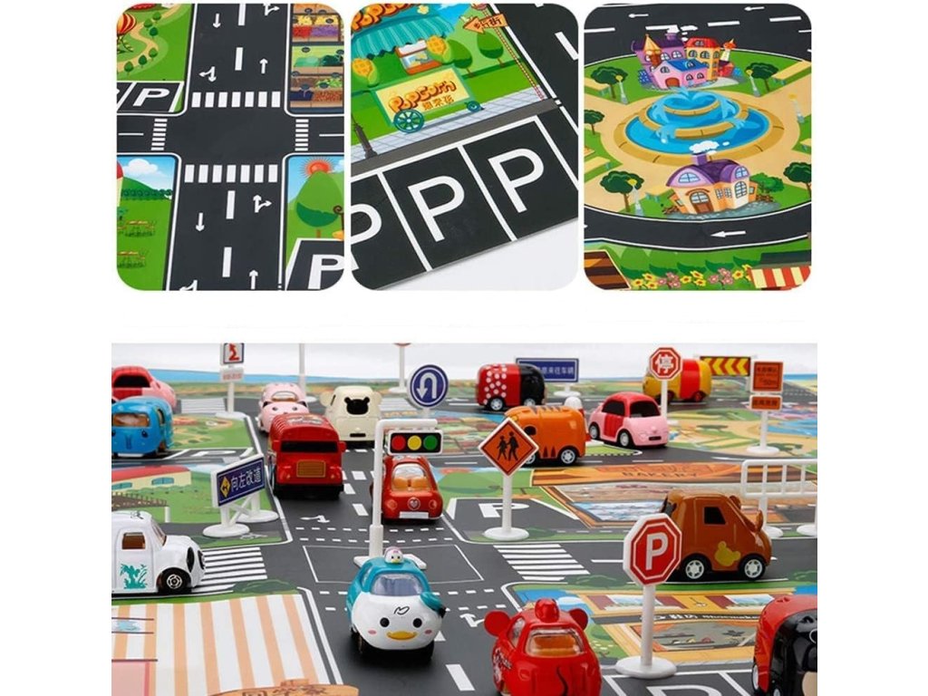 Az egyedi, közlekedési táblákkal ellátott játékszőnyeg teljesen új szintre emeli a játékot. A csomag akár 18 valósághű közlekedési táblát is tartalmaz, amelyeket a gyermek saját elképzelései szerint elrendezhet a szőnyegen. Ennek köszönhetően minden nap egy új és új város jön létre, amelyet a gyermek a saját fantáziája szerint épít, módosít és kezel.