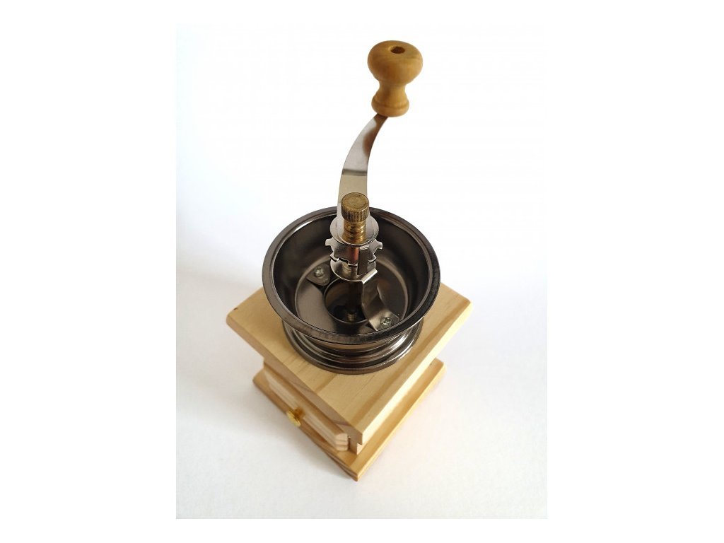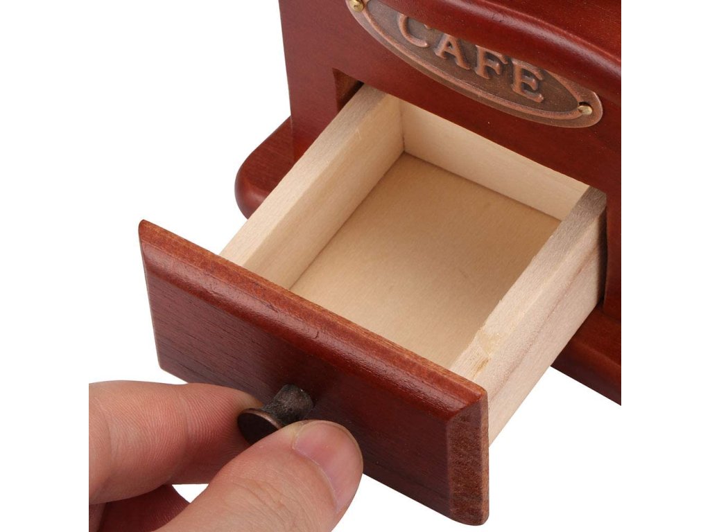 Könnyen kezelhető, a kávébabokat a tálba helyezzük, és a fogantyút többször elfordítjuk, majd az őrölt kávé a fiókba esik. A test fából készült, könnyen hozzáférhető fiókkal, az elülső fiókban az őrölt kávé elfér, készen áll a saját friss kávékeverék elkészítésére.