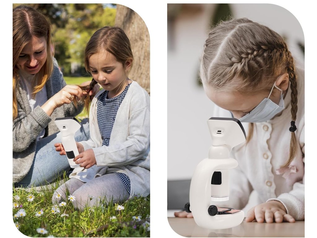 A digitális mikroszkópot kifejezetten gyermekek és tinédzserek számára tervezték, akik testközelből szeretnék felfedezni a világot. Segítségével megvizsgálhatnak leveleket , virágokat, szövetszálakat, a papír szerkezetét, sókristályokat vagy apró rovarokat .