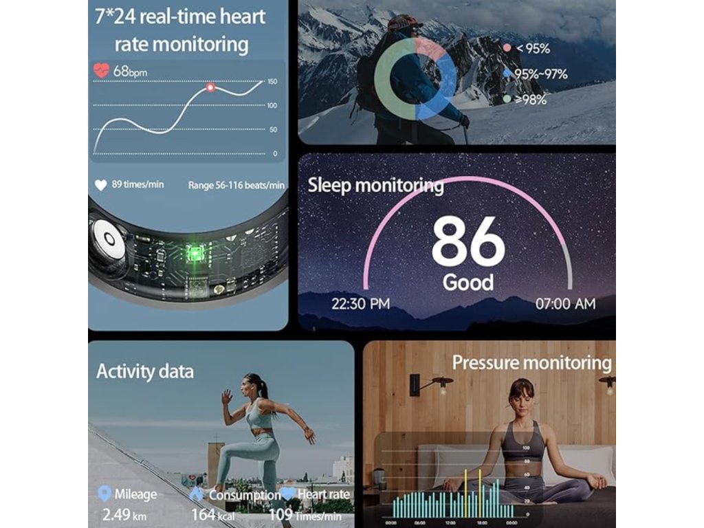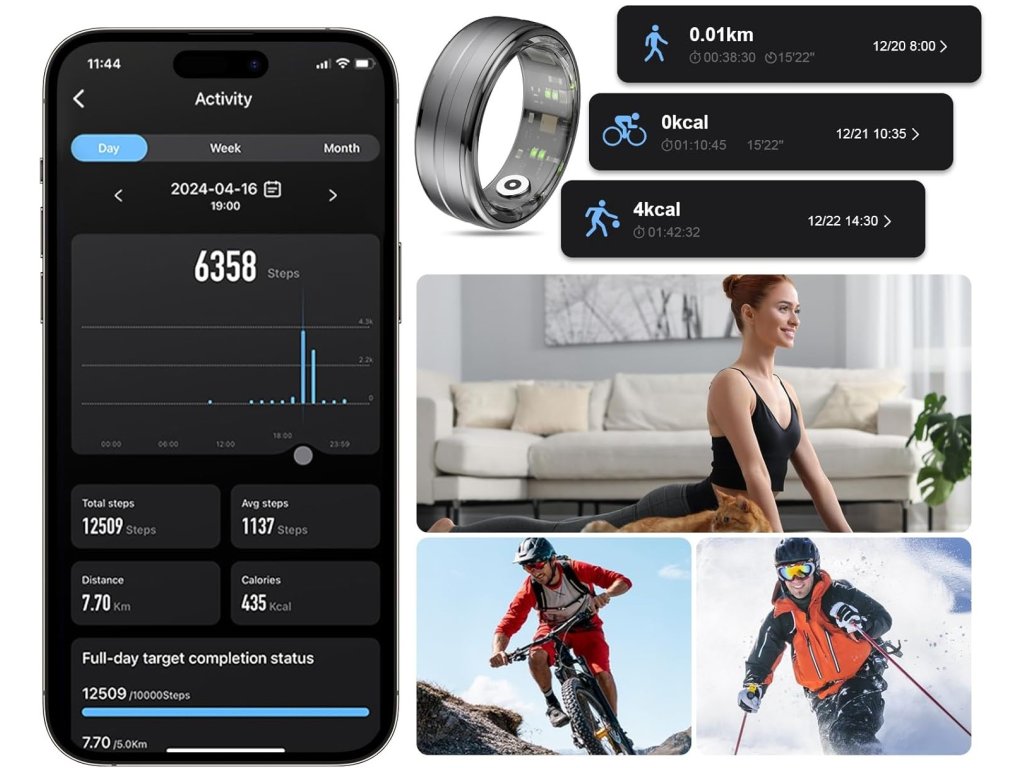 Fedezze fel teste titkait. Az okosgyűrű érzékeny érzékelőkkel van felszerelve, amelyek figyelik a kulcsfontosságú egészségügyi funkciókat, és segíthetnek elérni vagy meghaladni a sporttevékenységei határait. Még az alvásról is adatokat kaphat.