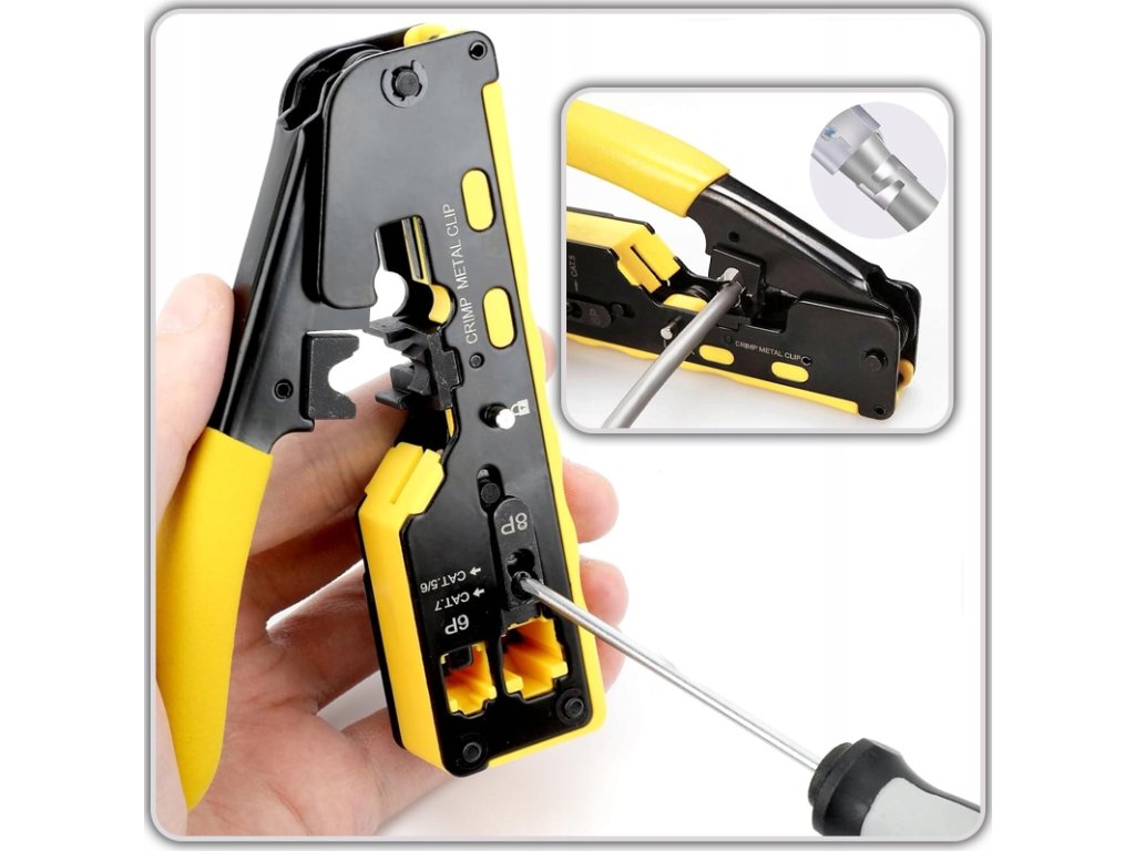 Ez a kiváló minőségű szerszám CAT.5e és CAT.6 moduláris csatlakozók krimpelésére szolgál, amelyeket gyakran használnak internetes és adatátviteli hálózatokban. A 8 és 6 pólusú csatlakozóknak köszönhetően a leggyakoribb csatlakozótípusokat pontosan és megbízhatóan kezeli.